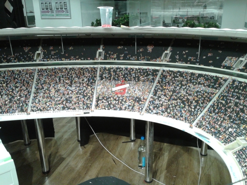 Auch im Olympia-Stadion geht das Kleben weiter. Teils sind die Ränge schon dicht besetzt. Oben auf dem Dach übrigens der andernorts mal erwähnte Halb-Liter-Becher. Auf dem Dach des neuen NDR-Studios findet so eine Art Public Viewing statt: Jan Hofer auf Großbildschirm. (Das Studio war ja der andere Grund, weshalb ich in Hamburg war). Wenden wir uns nun noch gen Italien. Die Weinberge strotzen von Detailreichtum. Jedes Träubchen einzeln angeklebt.