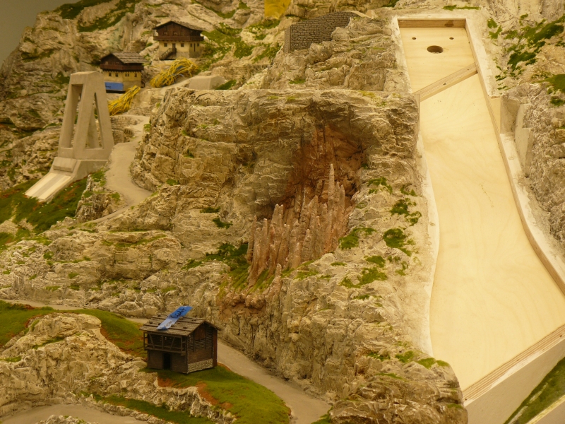 Violetter would have been better. Ein Stück querab haben die Erdpyramiden Ihren Platz gefunden, direkt neben der (noch unfertigen) Standseilbahn. Das letzte Stück Italien in diesem ,5-Bericht steht noch in der Werkstatt: Bei dieser Kirche knobelt man noch den optimalen Standort für die Lichtquelle zur Erhellung des Kruzifix aus.