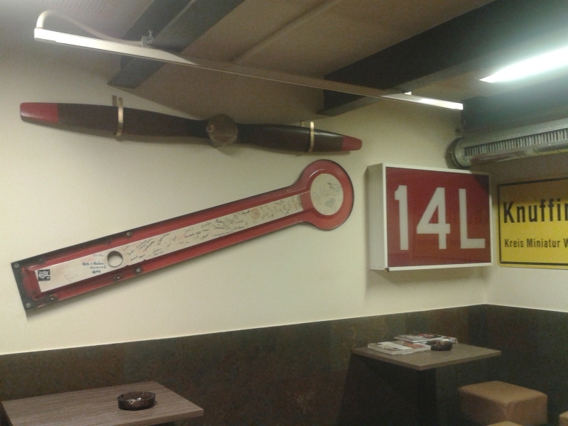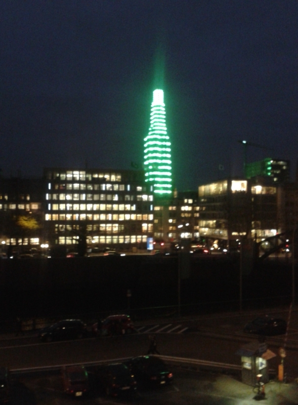 Im "Trophäen-Saal" (landläufig "Raucherraum" genannt) ist offensichtlich neulich frisch gestrichen worden. Jemand hat sich offenbar auch die Mühe gemacht, den "Signalflügel" zu restaurieren: Fremd-Unterschriften wurden, soweit möglich, weggeputzt, abgewaschen, ausradiert. Die Signaturen der "Befugten MFM-ler" dagegen blieben alle stehen. Leider ist mir der Name des Fachmenschen, der diese akribische Leistung vollbrachte, nicht bekannt. Der Blick aus dem Fenster: Es ist schon spät. Und nach dem "Blue Port" schimmert es heute Abend grün vom eingerüsteten Kirchturm. Wo ist jetzt wieder Sascha, der weiß das immer: Ist das Katharina oder Nikolai? Grüße nach Hamburg, besonders an das WB-Team.