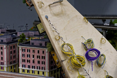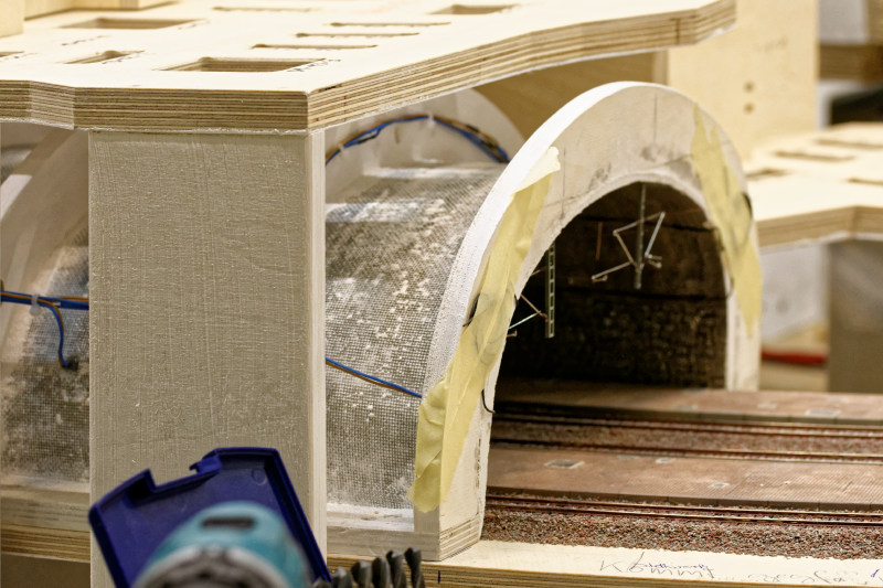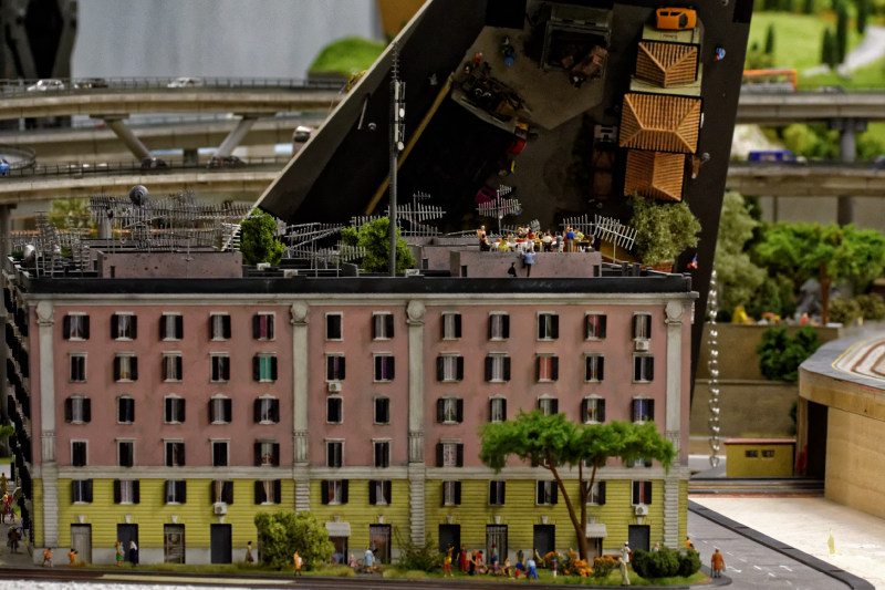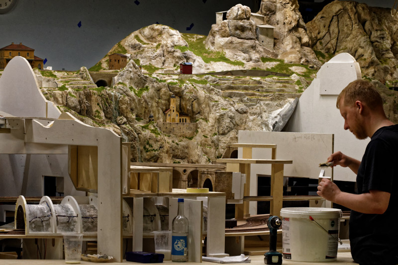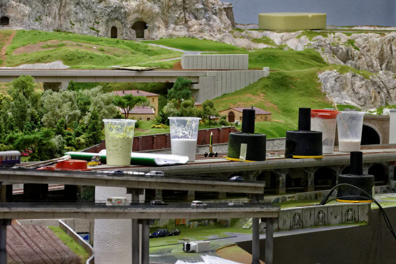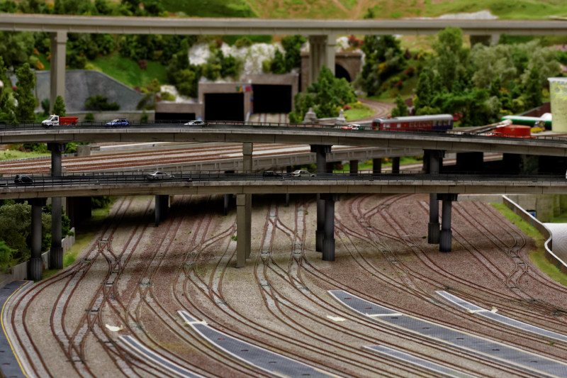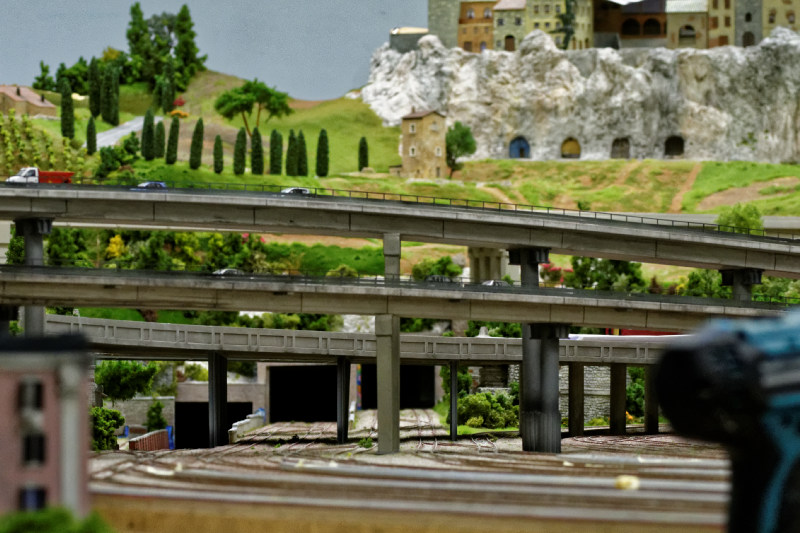 Während die während der Bauphase immer schwerer erreichbaren Bergspitzen schon fast fertig ausgestaltet sind, wird unten noch am Rahmen gearbeitet - in diesem Fall Brandschutzfarbe aufgetragen:Die ungeheure Komplexität wird deutlich, wenn man darüber nachdenkt, wie alle diese Strecken später bei Entgleisungen oder Wartungsarbeiten zugänglich sind, z.B. dieser elektrifizierte Tunnel:Ein paar Meter weiter ist es schon grüner:Die verdreckten Straßenbrücken vor einer sehr sauberen Bahnlinie könnten Spekulationen darüber hervorrufen, wie viele VW Diesel hier schon nach Italien exportiert wurden und ob auch andere Autohersteller zu der vorbildgerechten Alterung beigetragen haben. Vielleicht weiß dieser nebenberufliche Staubsauger darüber mehr?Hoffentlich denkt man dort später an eine Kameraplattform wie an der Hamburger Köhlbrandbrücke, damit solche Fotos später auch nachts ohne Stativ möglich sind:Als ich die Verkehrsführung (ohne Beschleunigungs- und Verzögerungsstreifen!) zum ersten Mal betrachtet habe, vermutete ich, das MiWuLa hätte vielleicht aus Platzgründen auf diese verzichtet. Aber ich habe geirrt: Die Tangenziale Est in Rom sieht im Vorbild haargenau so aus. Besonders hoch ist sie aus der Vogelperspektive gesehen nicht:Ganz anders aus der Sicht eines neben den Gleisen stehenden Preiserleins:Zurück zum Thema Zugänglichkeit: An potenziellen Häufungspunkten von Entgleisungen wurden Luken eingebaut:Notfalls auch in Wohngebieten:Kleine Häuser lassen sich nicht nur einfacher umkippen als große Häuser, sie kommen auch mit einer relativ sparsamen Verdrahtung aus:Fortsetzung folgt...