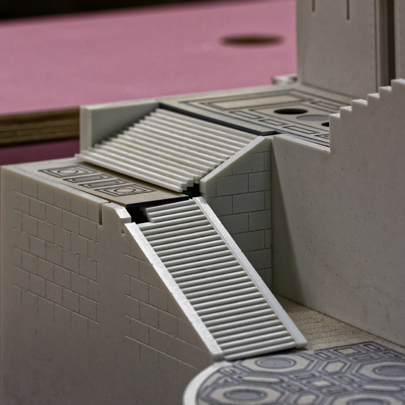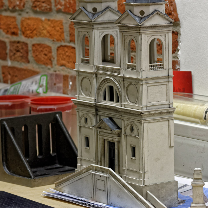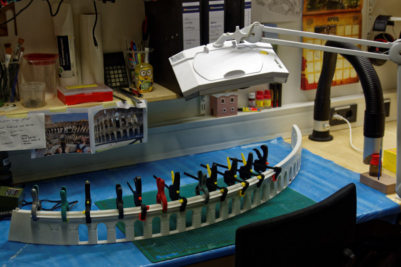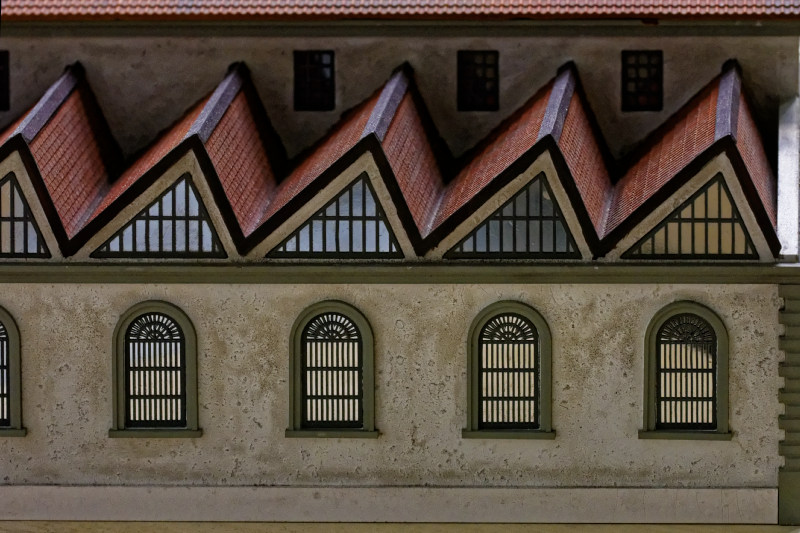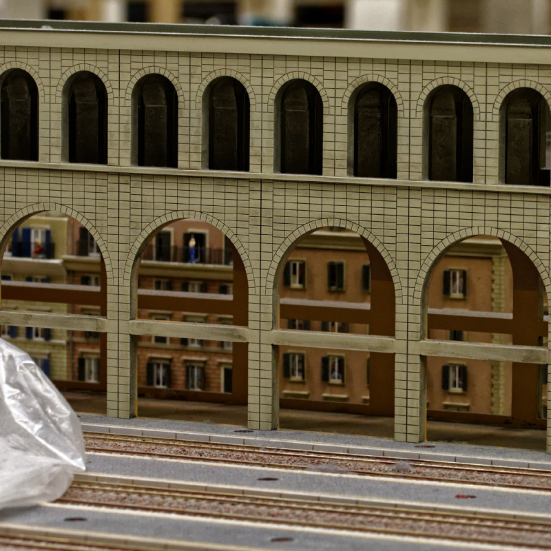 Hier mal ein Blick vom Kopfbahnhof in Rom durch die Arcaden in Richtung einer parallel stehenden Häuserzeile:Ich befürchte, dass dieser Blick nicht mehr möglich ist, wenn das Gebäude erst beleuchtet sein wird:Wenn man der Aussage glauben schenkt, dass das gesamte MiWuLa eine einzige Handschrift trägt (aus diesem Grund hatte man ja im Jahr 2000 Handwerker statt Modellbahner eingestellt...) dann kann die Notiz nur von Gerd sein, oder?Wozu dient eigentlich dieser Aluprofilrahmen? Und warum habe ich in Italien nur eine Handvoll Modellbauer gesehen? Achso, die Werkstätten... da geht es auch voran, trotz höchster Ansprüche, z.B. am Kolosseum:Das Zusammensetzen und -kleben dieses Profi-Puzzels ist nur der zweite große Arbeitsschritt (nach Konstruktion und Herstellung der Teile), bevor im dritten (oder je nach Zählung im 4., 5. oder 10.) Schritt die fachgerechte Alterung ansteht:Nicht nur Macken und Ausbesserungsstellen werden "nachgerüstet", sondern vor auch farbliche Unregelmäßigkeiten:Und zum Schluss müssen alle Module zusammenpassen:Dieser aufwändig per CAD konstruierte Treppenbausatz des Monumento a Vittorio Emanuele II hat vor der Nachbearbeitung noch große Ähnlichkeiten mit dem Standardmaterial eines beliebigen Modellhäuschenherstellers:Etwas älter wirkt schon dieses Objekt:Fortsetzung folgt...