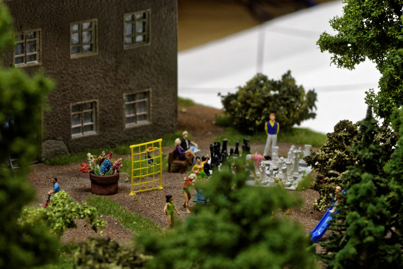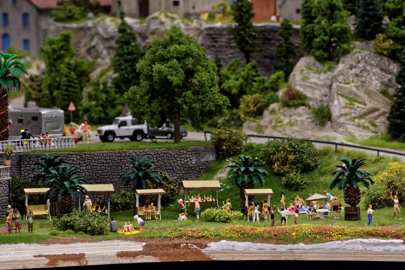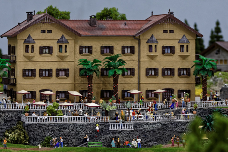 Nun noch ein paar Bilder aus (fast) fertigen Bereichen. Eine Detailaufnahme des Bahngebäudes aus dem letzten Wochenbericht:Hier lässt sich genütlich einkehren:Oder schaukeln:Es heißt, dass in Italien weißer Marmor produziert wird. Vielleicht wurden daraus auch diese Schachfiguren gefertigt?Ideen für lustige kleine Szenen scheint es genug zu geben...Wenn es sein muss, auch ernst:Gute Nerven sollte man haben, wenn der Busfahrer vor hat, auf dieser Strasse mit der zulässigen Höchstgeschwindigkeit zu fahren:Getreu dem Motto: