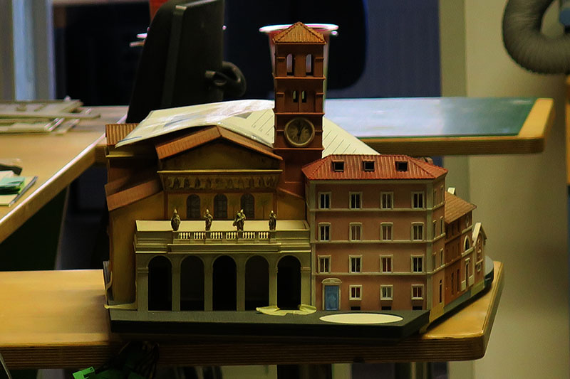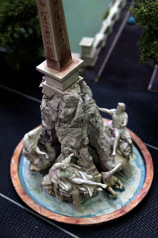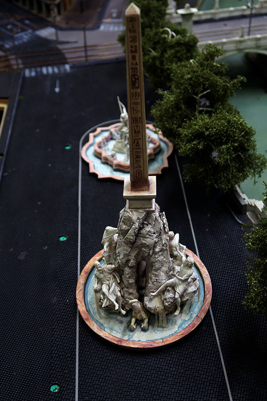 Das dreifache Ensemble auf schwarzem Pflasteroval identifiziere ich mal als Piazza Navona, der "Vier-Ströme-Brunnen" von Bernini in der Mitte (der mit dem Obelisken). Aber auf der Spitze des Obelisken sollte eigentlich noch eine bronzene Taube sitzen. (Siehe dazu Dan Brown: Illuminati; Bastei-Lübbe).