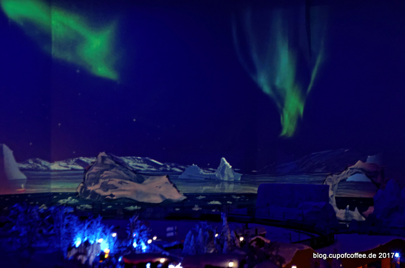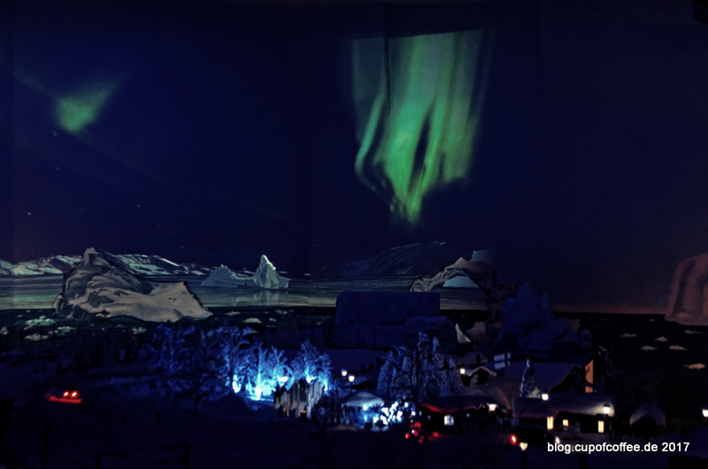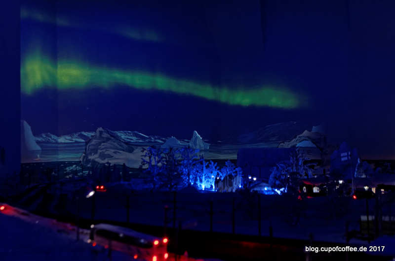 Wie schon im Film zu erahnen, ist die Beamerprojektion der Aurora wirklich toll geworden. Nicht nur die Leuchteffekte sind interessant, sondern auch die Tatsache, dass sich das Meer als Projektion fortsetzt und dabei erstaunlich dreidimensional wirkt. Etwas, was sich im Film und auf den Fotos kaum darstellen lässt. Überhaupt war das Ablichten eine längere Prozedur, da die Wunderlandnächte ja bekanntlich deutlich kürzer sind, als die Tage. Nach der dritten Nacht klappte es dann mit den Kameraeinstellungen endlich so leidlich. Für den Camcoder war dann noch mal die gleiche Prozedur notwendig und irgendwie musste ich die ganze Zeit an die Vesuv-Serie von Feuer-wer denken...