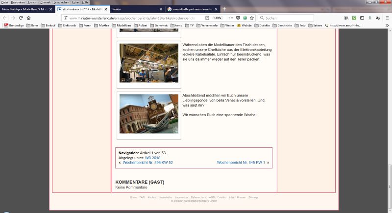 Der Wochenbericht 901 beginnt wieder "morgens um halb sieben" (eine gute Serie!) und zeigt Frühaufsteher Arne beim Transrapideinfädeln, Werkstattgeräusche im Monte Carlo der Zukunft, Strippenzieher, Bimmel-Bammel-Typen (könnte eine Knopfdruck-Aktion in Venedig werden), weitere Details aus dem Venedig-Endspurt inkl. wirklich herrlicher Figuren von Bobby zum Karneval in Venedig, Kabelsalat aus der Unterwelt und dessen Beherrscher, und zuletzt eine ziemlich große Lieblingsgondel als Sonderanfertigung.