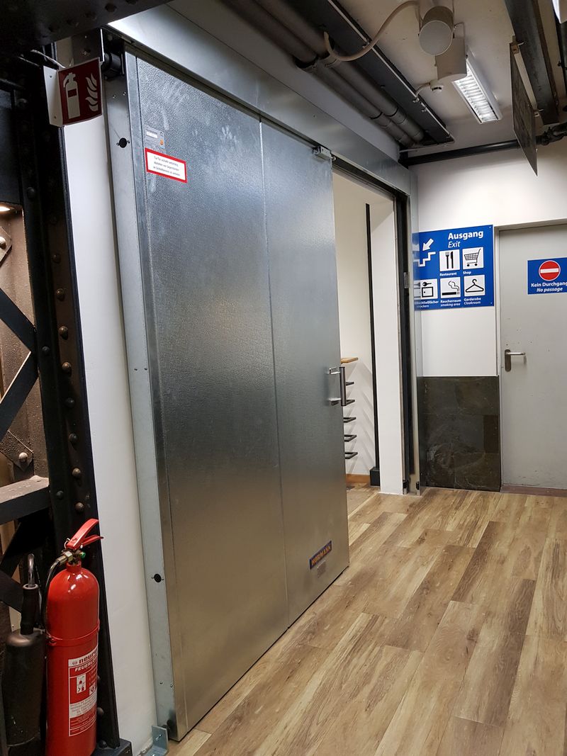 Zwischen der Schweiz und Venedig wurde eine neue Feuerschutztüre eingebaut, ebenso sitzt Leo vor einer neuen Feuerschutztür.