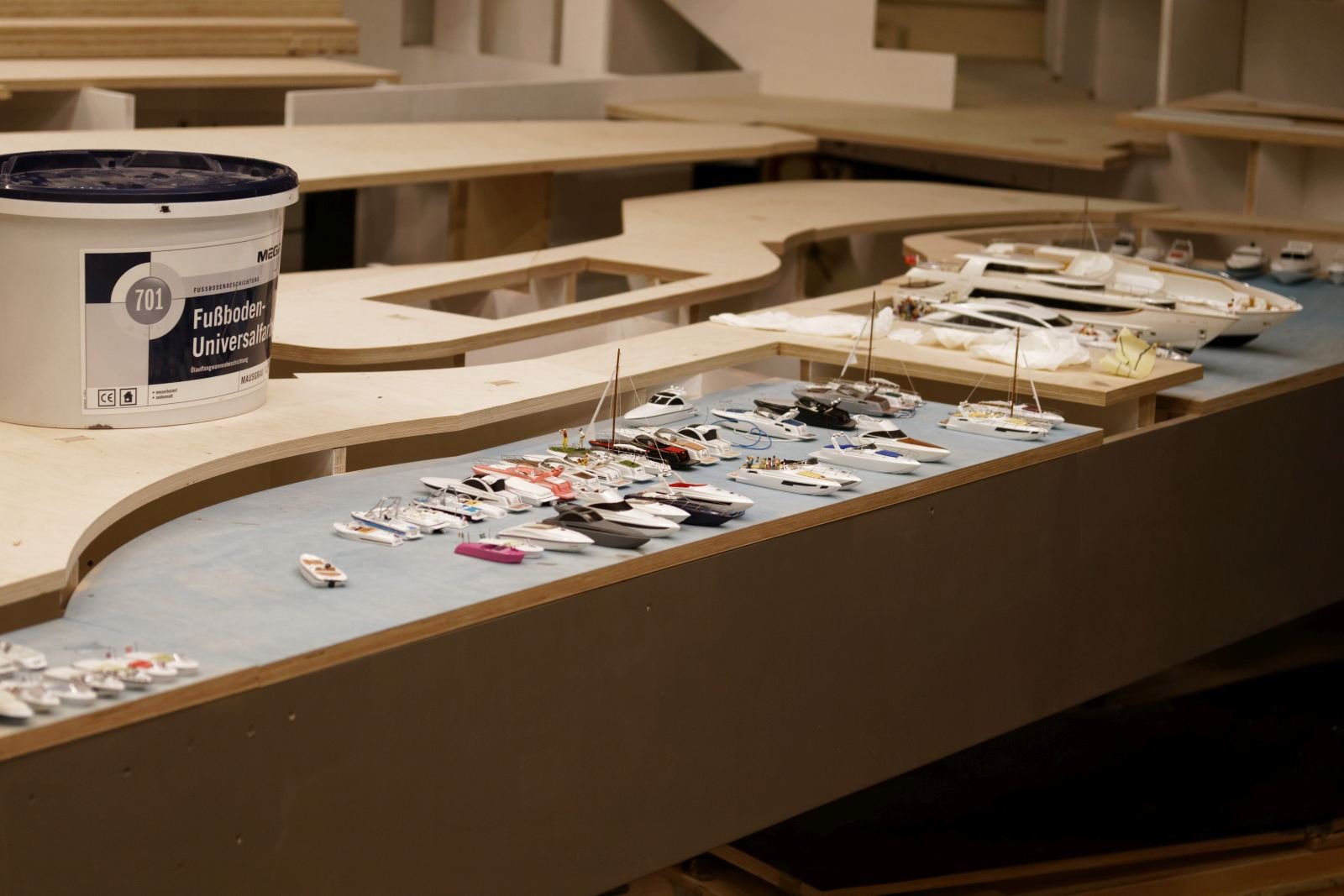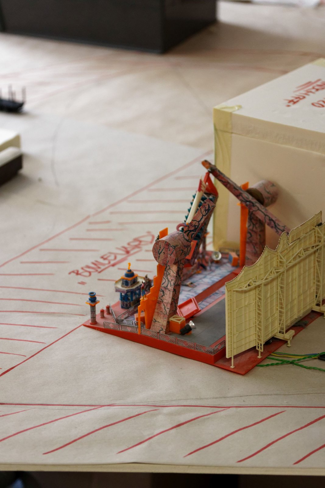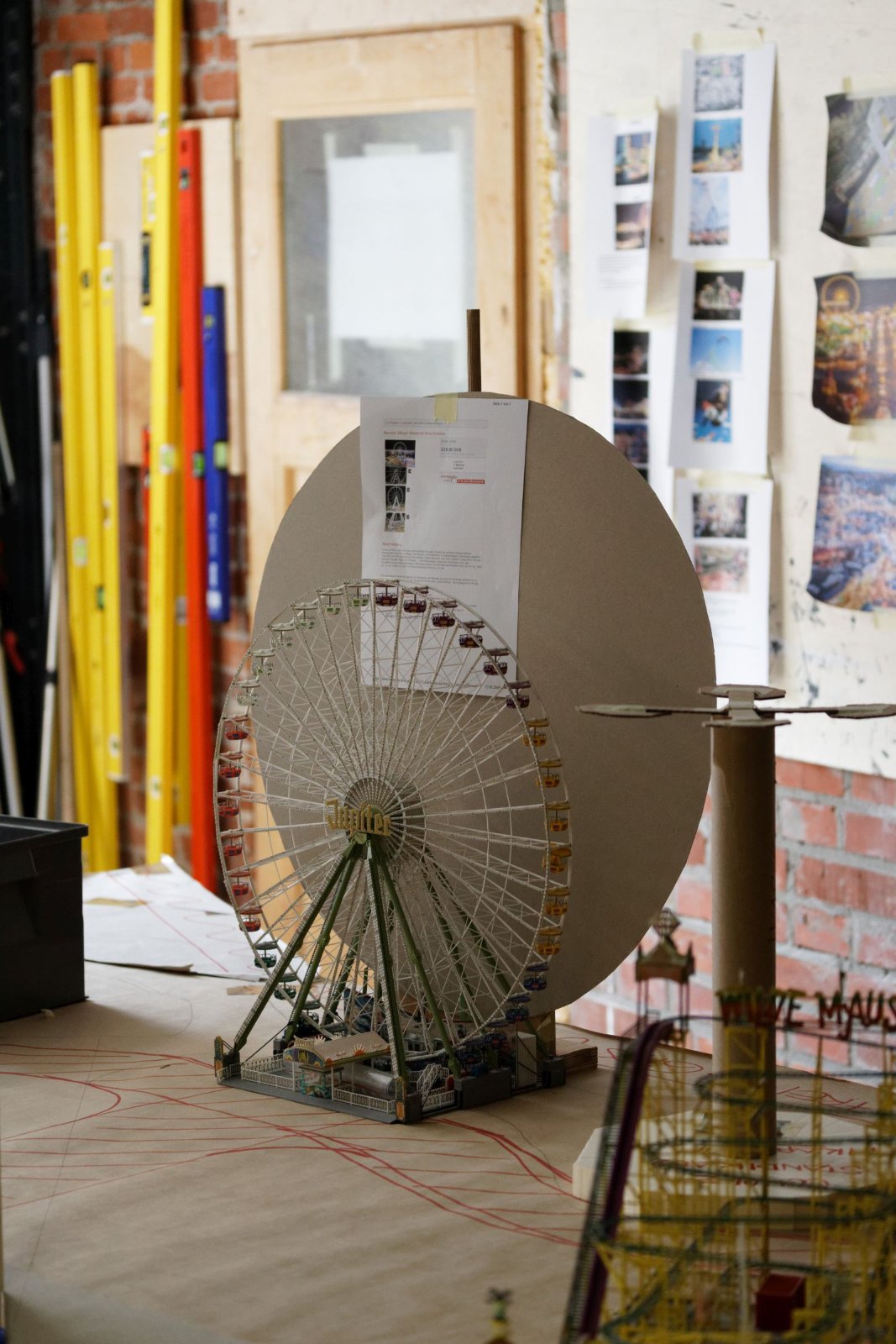 Rechts von der Provence, also im Bereich der zukünftigen Brücke, gibt es eine Stellprobe für den neuen Jahrmarkt. Pappmodelle von Riesenrad, Freifallturm und Co. verdeutlichen die Planung der neuen Kirmes.