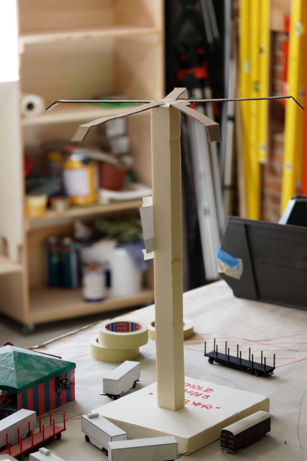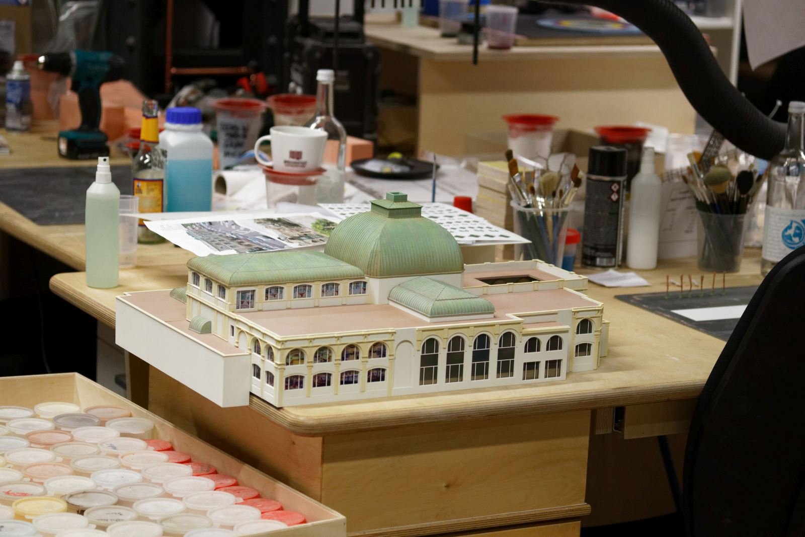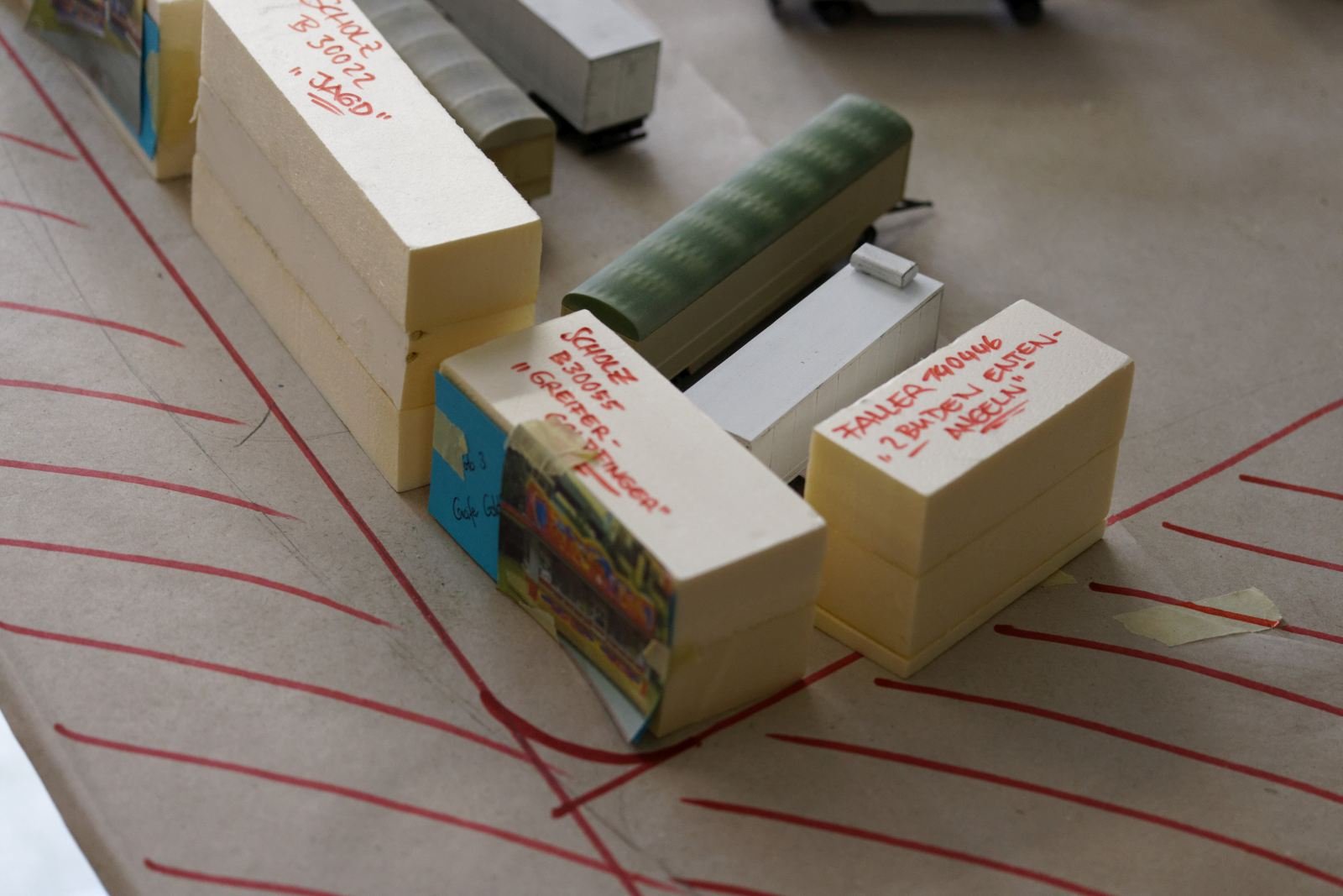 Rechts von der Provence, also im Bereich der zukünftigen Brücke, gibt es eine Stellprobe für den neuen Jahrmarkt. Pappmodelle von Riesenrad, Freifallturm und Co. verdeutlichen die Planung der neuen Kirmes.