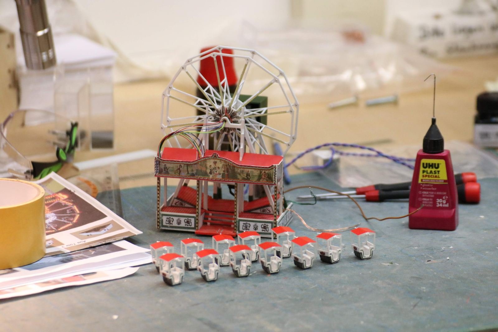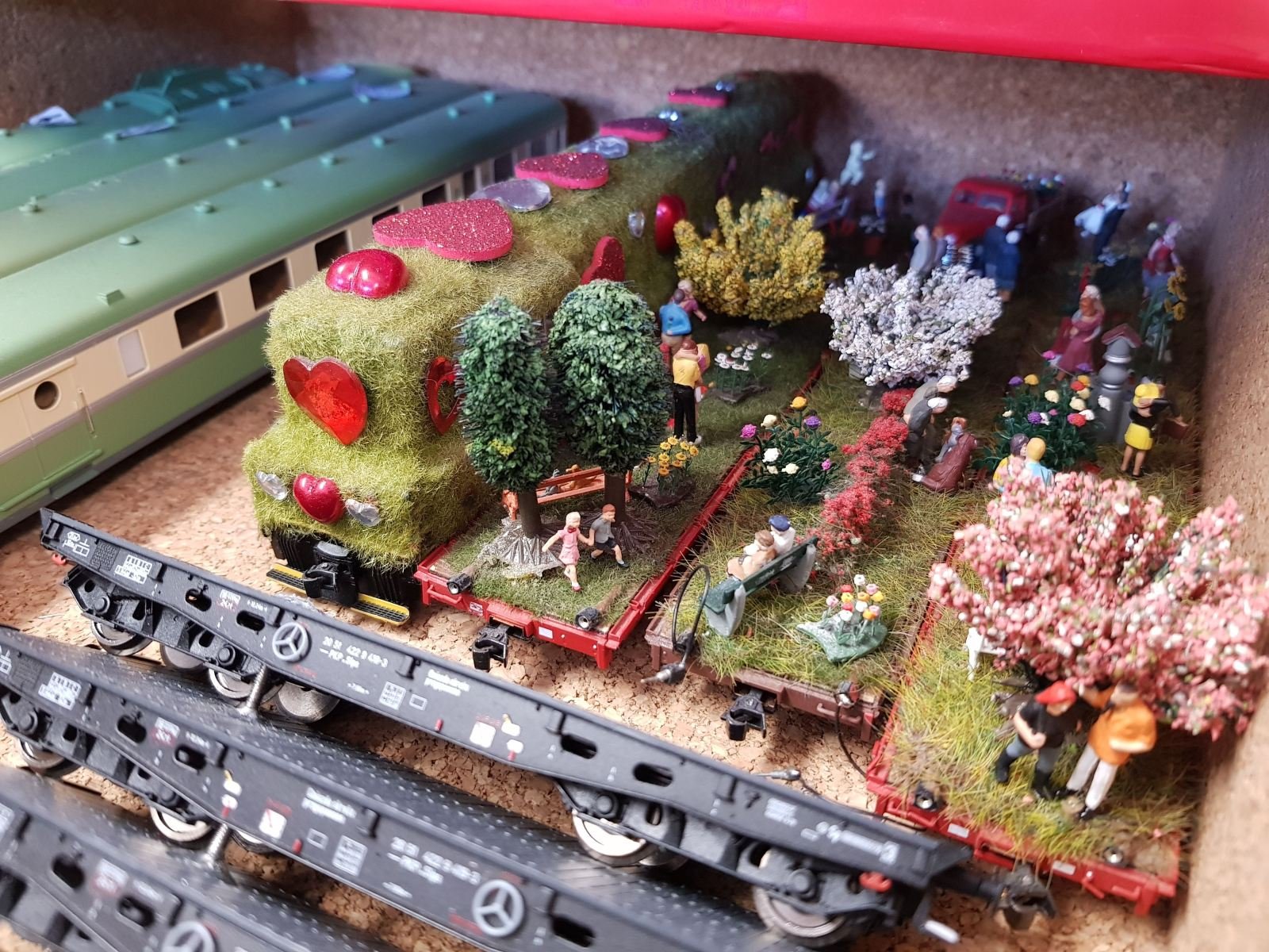 Seit dem 27. ist der Osterzug wieder in der Vitrine zuhause und der Sommerzug versucht, die verrosteten Getrieberäder zu lockern. Am Nachmittag ist ihm das gelungen und die Party konnte starten. Noch keinen Platz in der Vitrine hat der Valentinszug, er fristet sein Dasein in Gittas neuem Domizil. Enorme Energie wird allerorten in die Runderneuerung der Kirmes gesteckt, ebenfalls bei Gitta lagern zur Zeit die Nieten und die Hauptgewinne der Losbuden. Teresa baut ein Zwergenrad