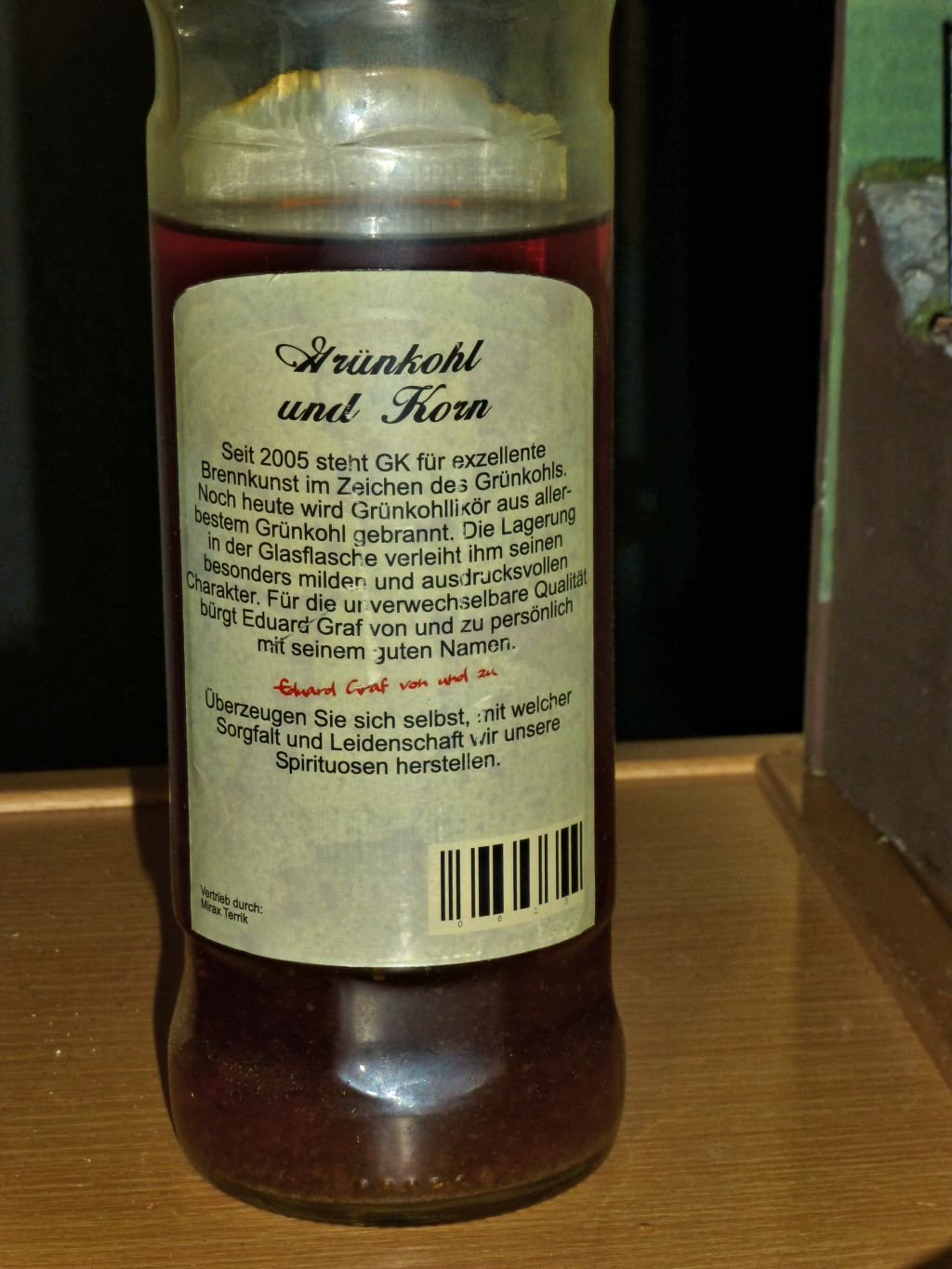 Achja, die Grünkohlflasche steht bei mir. Ich bekam sie bei einem Treffen auf der Intermodellbau von Mirax für meine Verdienste um den Grünkohl geschenkt. Gut, das mit den Verdiensten hat Björn anders gesehen, sich aber bei der Übergabe der Flasche schief gelacht.