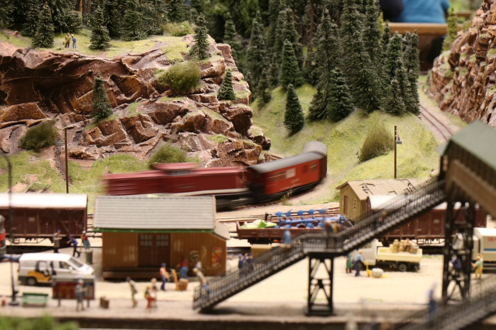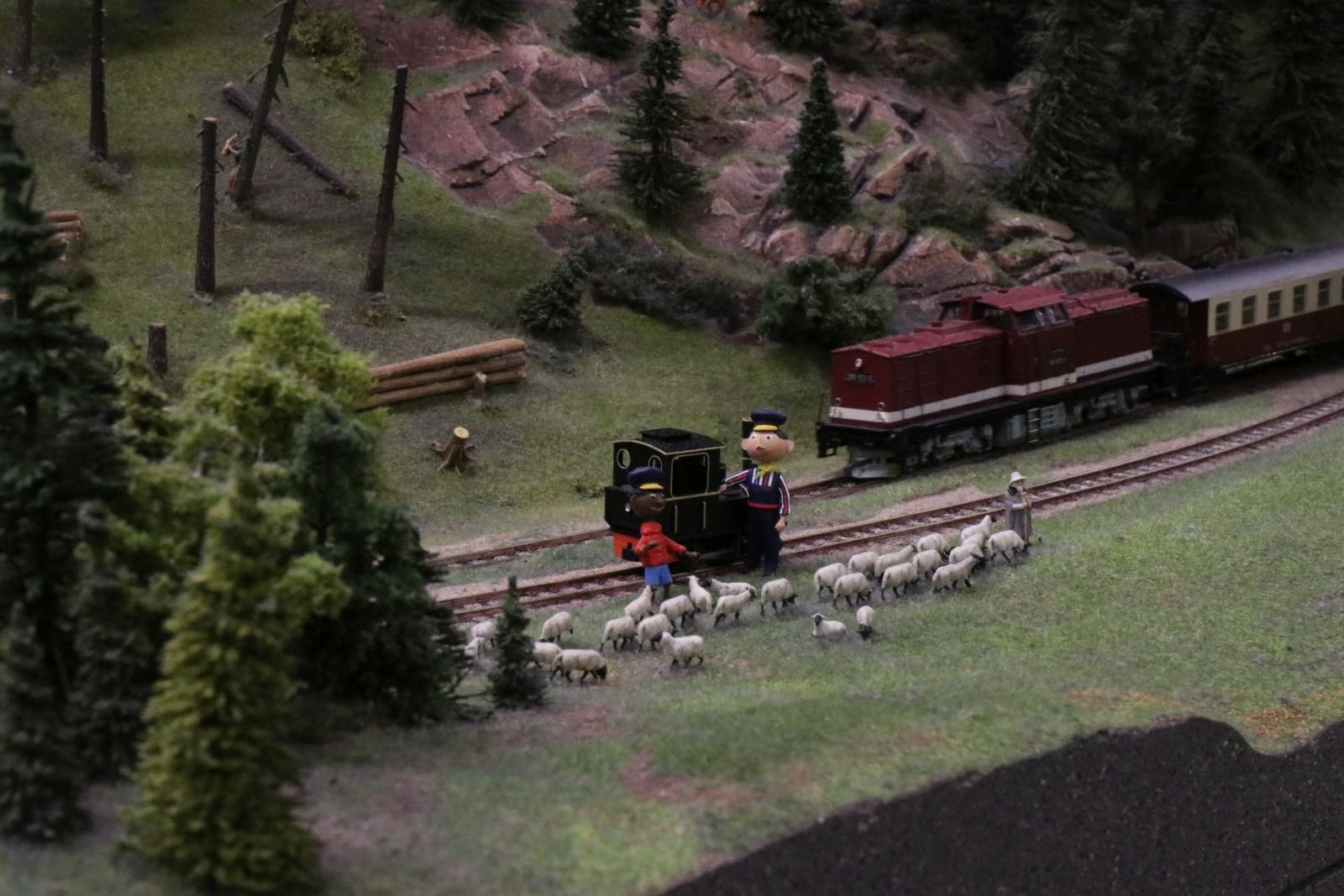 Prominent am Anlagenrand platziert flirtet er mit neugierigen Forumanen und gibt Besucherinnen bereitwillig Auskunft über die Ausbaupläne. Er ist, ich sage es mal vorsichtig, nicht begeistert von den Fahreigenschaften der Schmalspurbahn. Die Wagen sind, trotz verbauter Gewichte, federleicht und lassen sich einfach umpusten. Mal schauen, wie sich die Fahreigenschaften im Dauerbetrieb zeigen. Auch die Gleise sind nicht unbedingt für Grobmotoriker geeignet. Mit Höchstgeschwindigkeit fährt die Taigatrommel durch den Harz Apropos Höchstgeschwindigkeit, der neue Feuer-Wer-Wechsellader HH-2978 rast im Moment ziemlich über die Anlage.