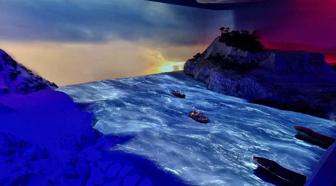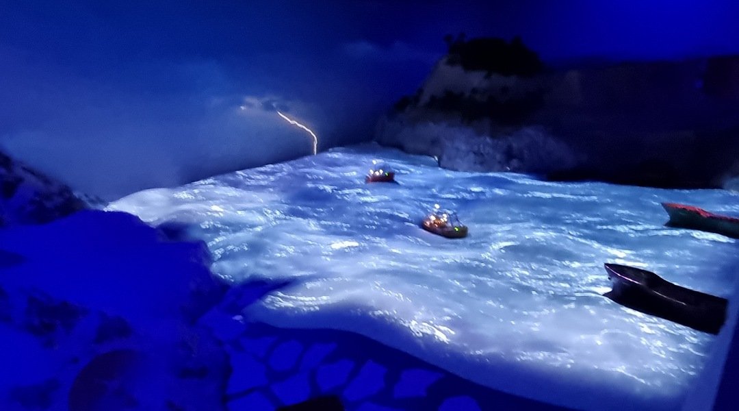 Die beiden halbierten Schiffe an der vorderen Anlagenkante sind Smartphone Halter, um als Besucher eigene Videos mitten in der rauen See zu machen - so zumindest stand es in einem Kommentar im entsprechenden MiWuLa eigenen Video. Scheint aber wohl nicht wirklich bekannt zu sein, oder getraut sich nur niemand...