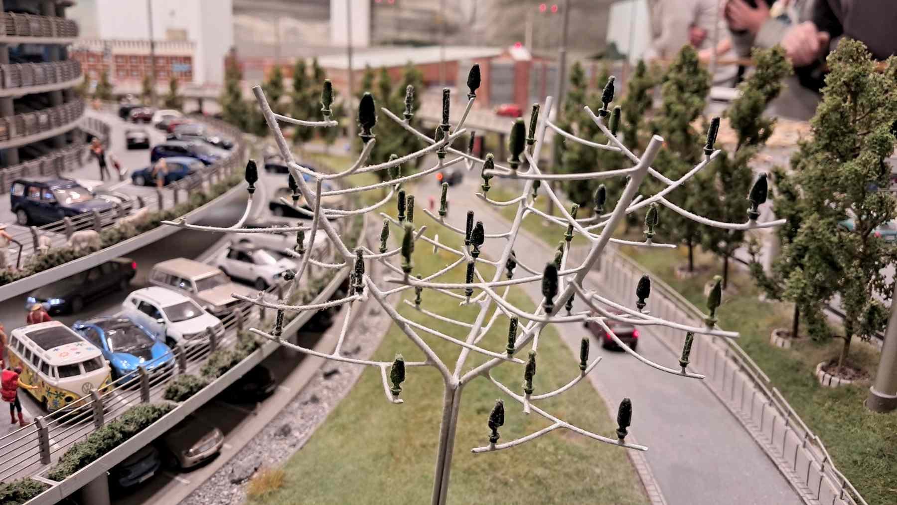Der Modellbaum steht auf der Flughafenanlage rechts vor den großen Parkhäusern.