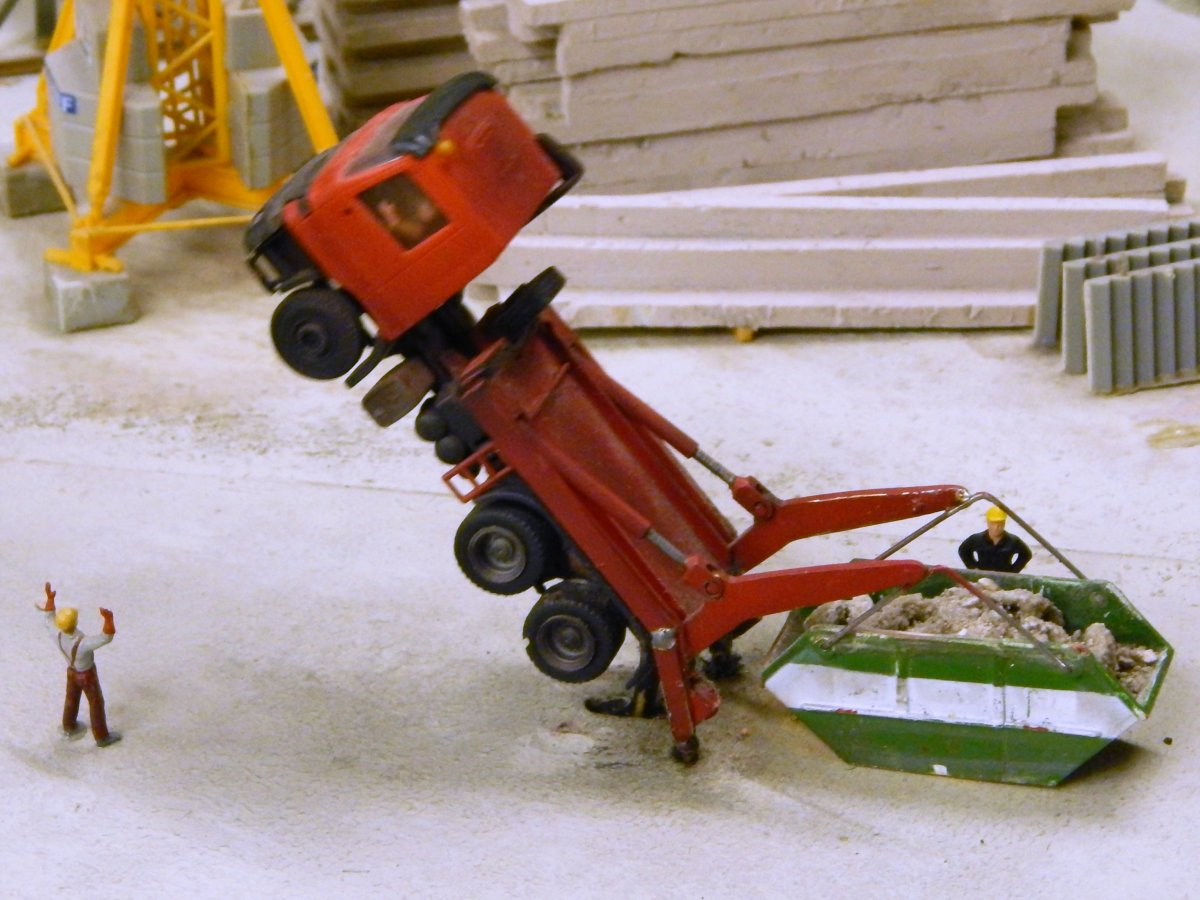 Eine Modelleisenbahn, die auf Masse statt Klasse ausgerichtet wäre, würde Knopfdrücker wie diesen überladenen Absetzcontaineroder diesen übermütigen Abschlepperim Dutzend verwenden und in jedem Bauabschnitt jeweils einen davon unterbringen, statt immer wieder mit endloser Kreativität die Grenzen des Möglichen neu auszuloten.