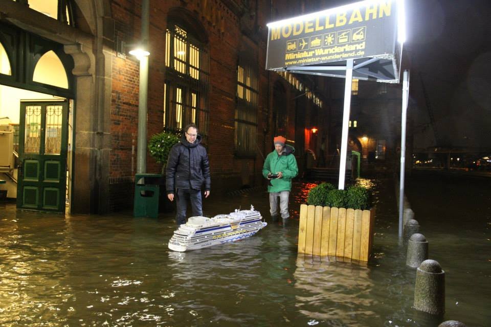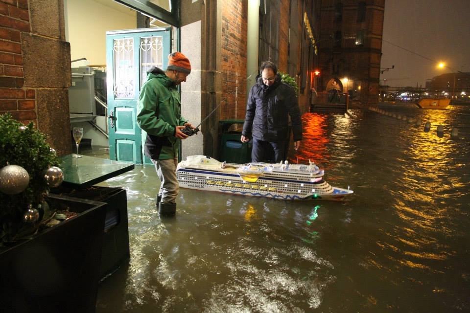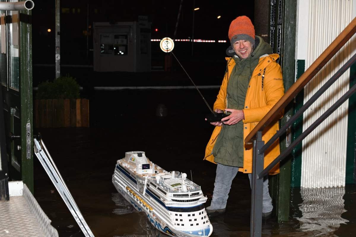 Dann müsste doch Freddy am Fleet stehen, mit einer Fernbedienung. Und am besten der Wasserpegel als Knopfdrücker steigen. Schließlich kam die Aida nur bei Sturmflut bisher raus in die weiten des Fleets.
