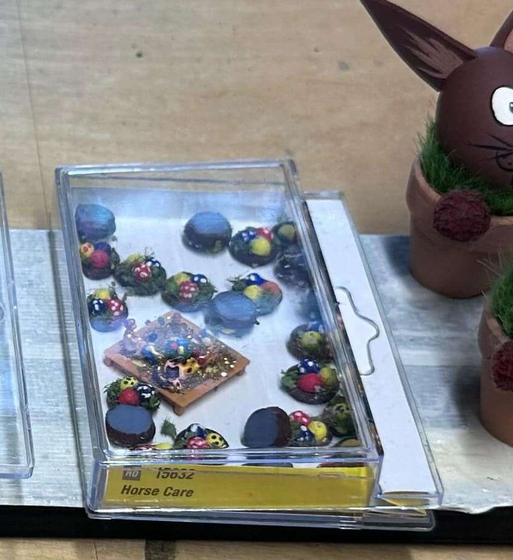 Gittas Oberleitungsreinigungszug ist schon etliche Jahre alt, aber immer wieder wunderschön anzuschauen. Die Rammelhaseninvasion im Modellbau scheint mir zum Teil für die Anlage, aber auch für das Drumherum geplant zu sein. Sehe ich das richtig, dass die Goldhäschen ein rotes Halstuch tragen - gedacht etwa "mit Glöckchen"?