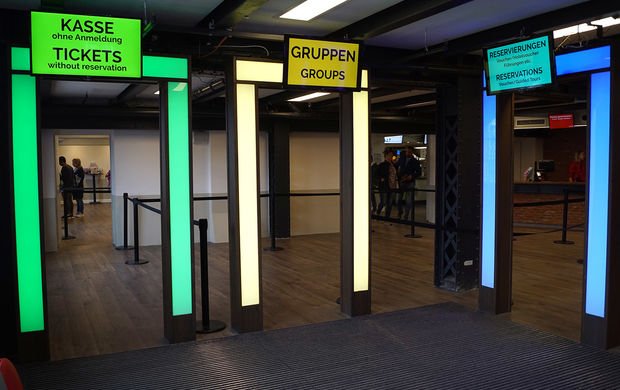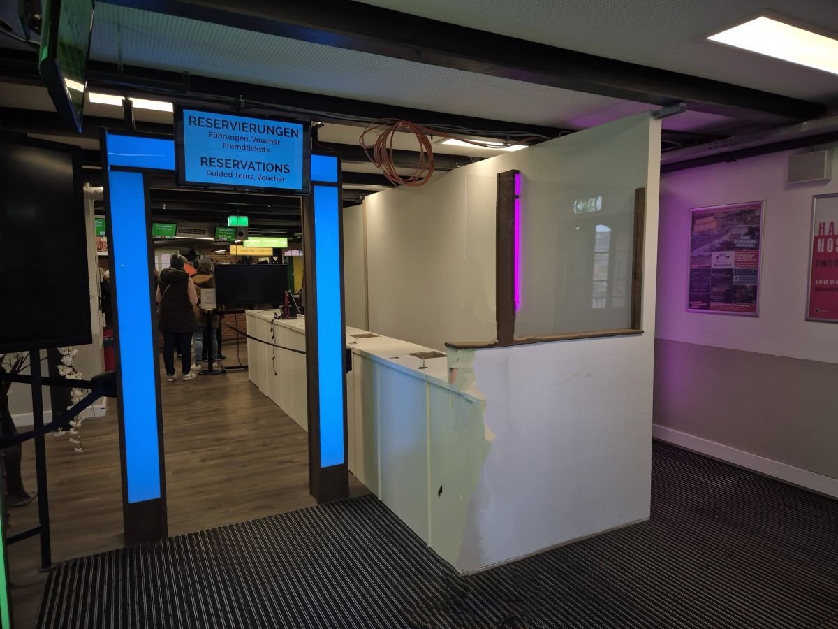 August 2012 : Umzug des Eingangs in den 2. Stock Damals gingen die Besucher am menschlichen Drehkreuz vorbei und an der Fensterfront entlang zum Shop.